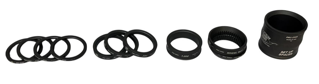 This is the easiest and longest lasting spacer kit we’ve seen. There are 2 outer cones; the inner one of the two has a taper to go into the wheel and the outside of that cone is flat. The outer cone is flat on the inside to fit against the inner cone. The outside of the outer cone is tapered for the axle nut. When moving the wheel in, take spacer from inside and put it in between outer 2 cone spacers. No more looking for the right outer spacer when changing the inner one! What separates this kit from other ones like it, is the 2 outer cones are splined, which keeps them centered. The spacers have a special coating, which doesn’t wear. After a year of track testing, the spacers still looked new.